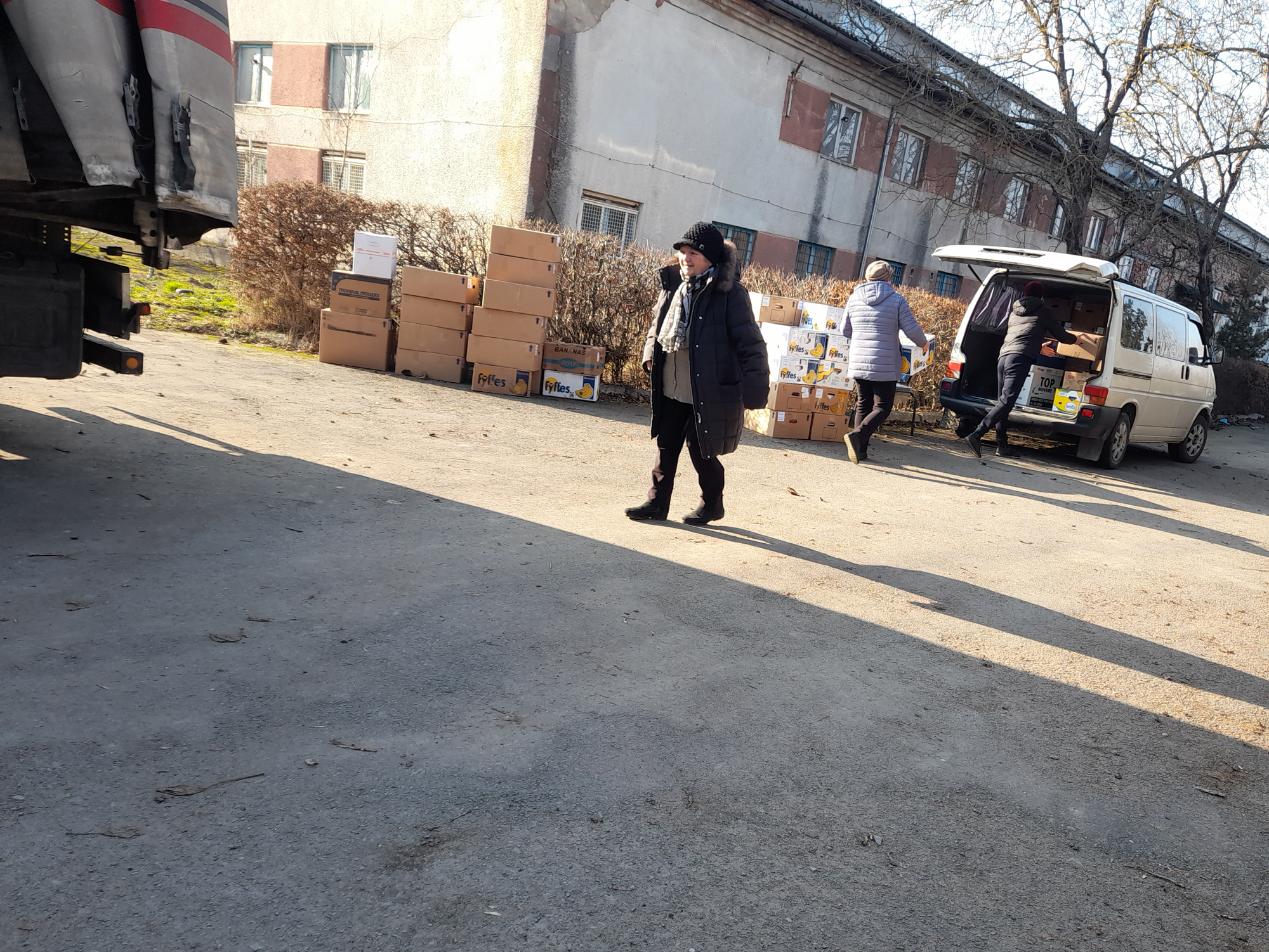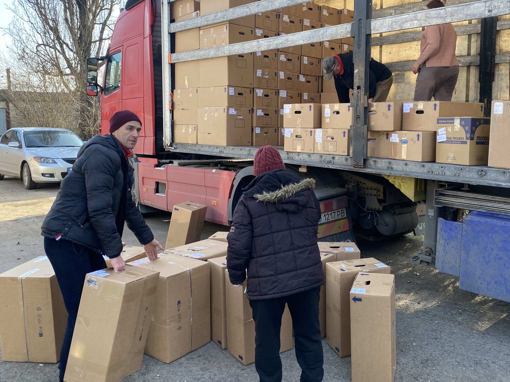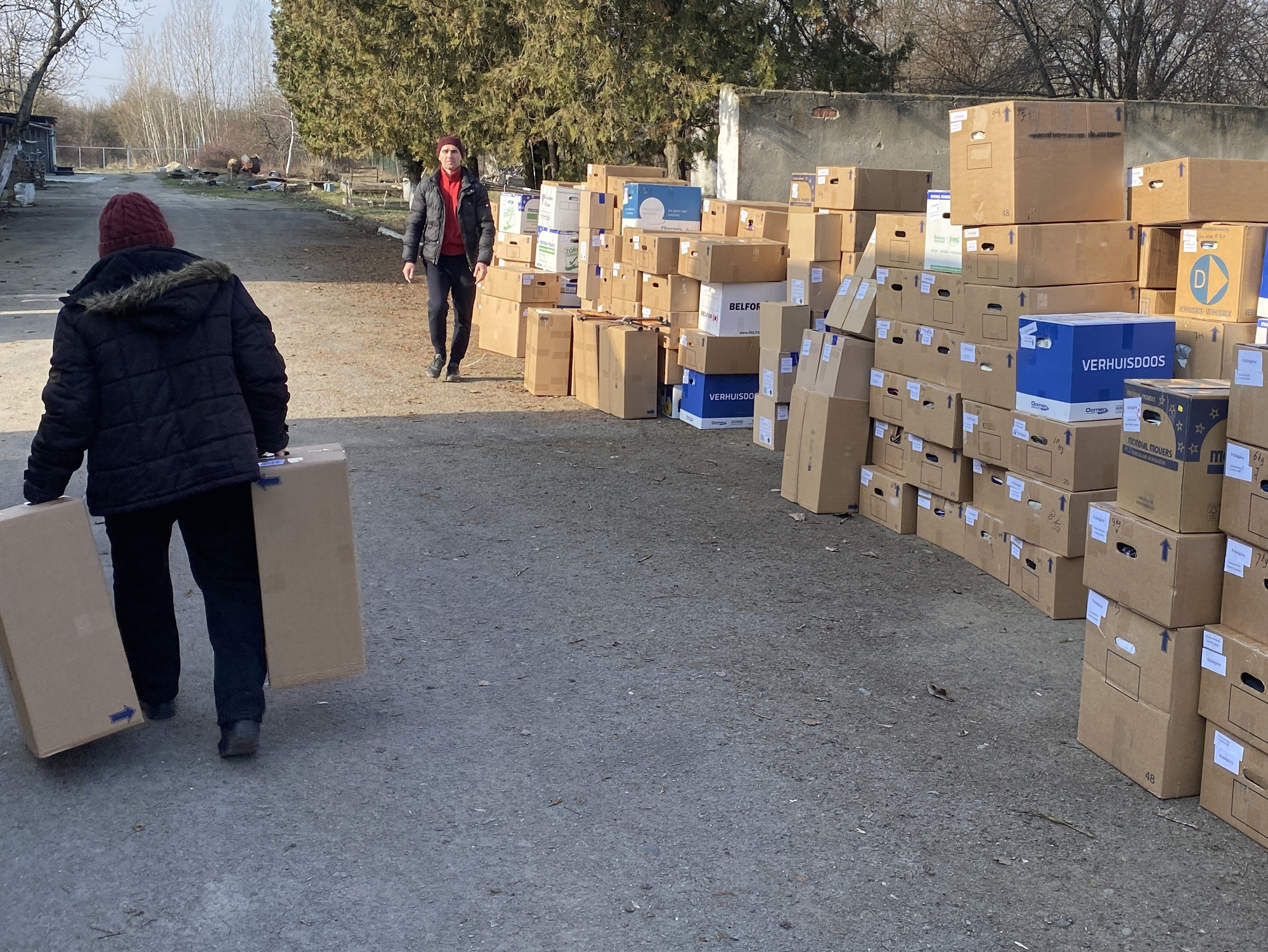 Op maandag 16 februari kwam de trailer in Beregowo aan. De contactpersonen waren van te voren gewaarschuwd, zodat ze de lading meteen konden lossen en verdelen conform de plaatsnaam stickers op de dozen.